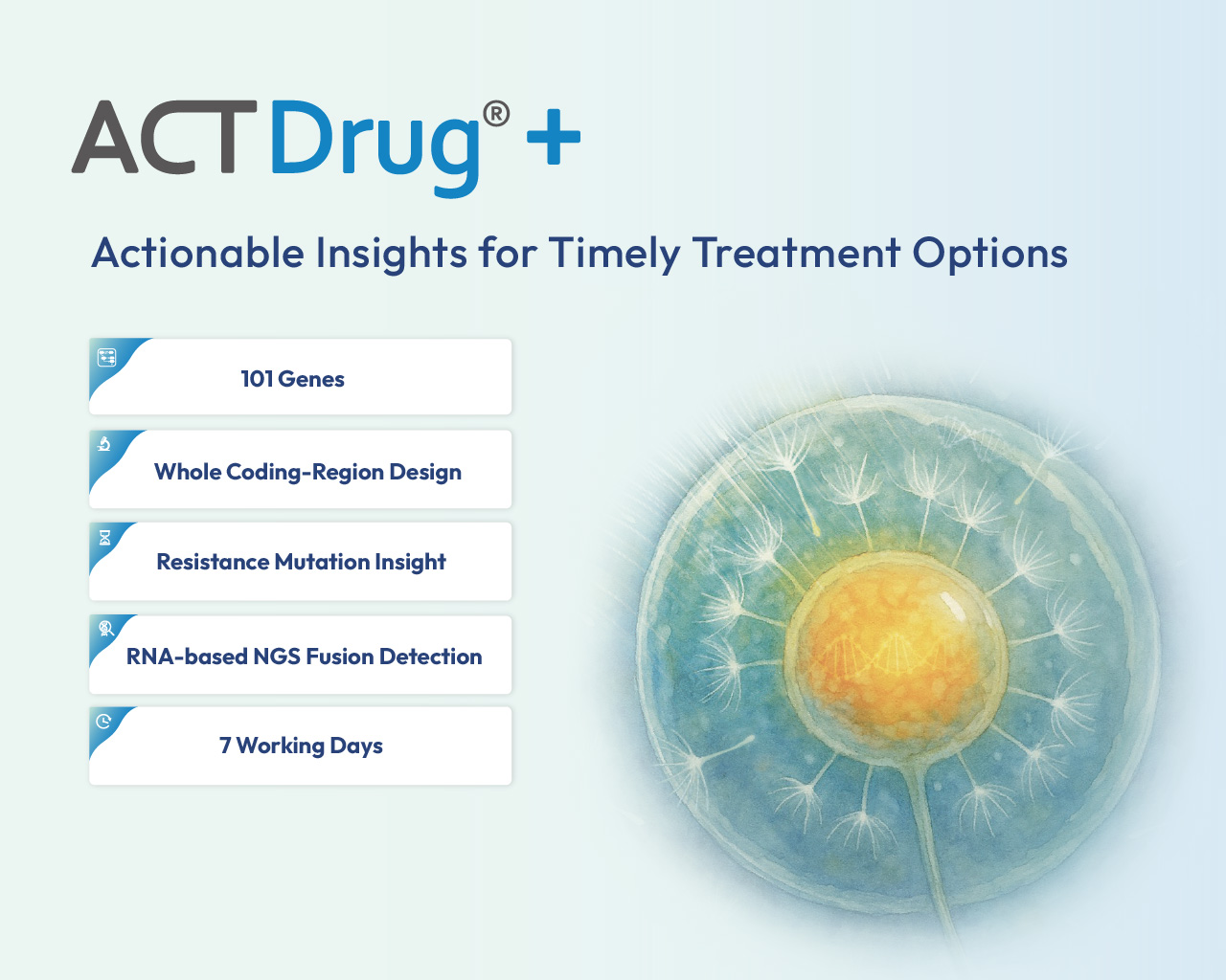 ACTDrug® 檢測服務未必於所有國家或地區提供。服務供應情況可能因當地監管要求及實驗室服務安排而有所不同。醫療專業人員應向 ACT Genomics 或當地授權合作夥伴查詢,以了解其所在地區的服務供應情況。